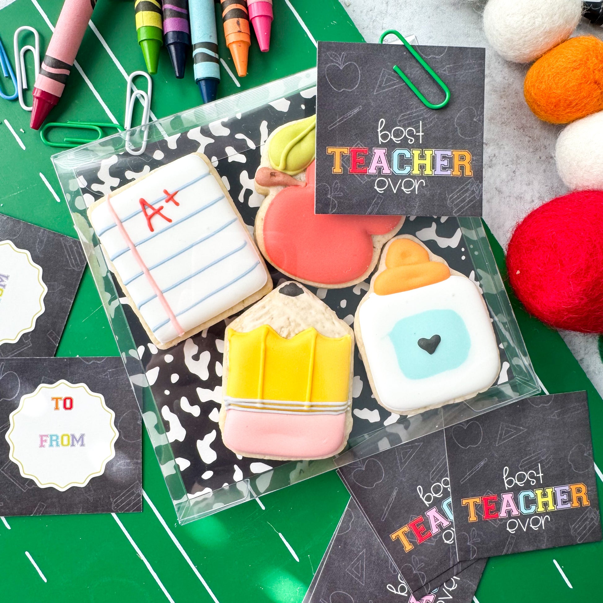set of 24 pre-printed, pre-cut, 2x2” double sided square tags on high quality gloss cardstock.