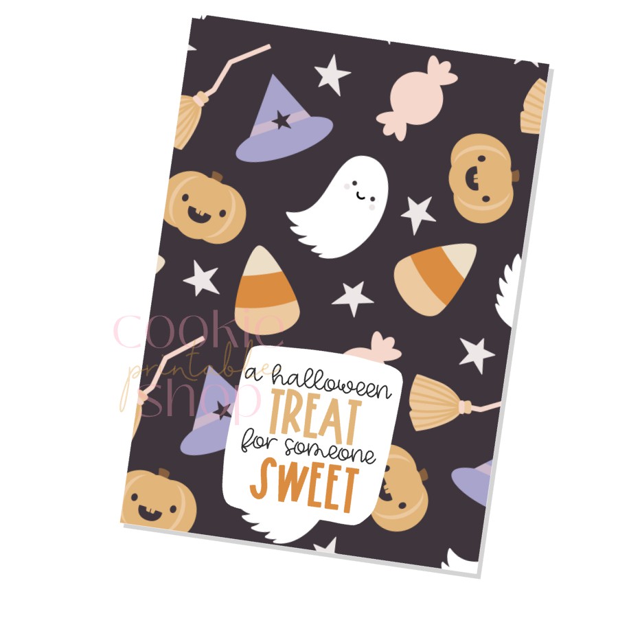 These cookie cards are the perfect thing for your Halloween mini cookies! I designed cookie cards specifically for mini cookies (2") to elevate your packaging and help you make more profit per cookie. Seal a mini cookie in a cellophane bag, then attach it to the card with your adhesive of choice (glue dots, tape, double stick tape, and hot glue all work!)